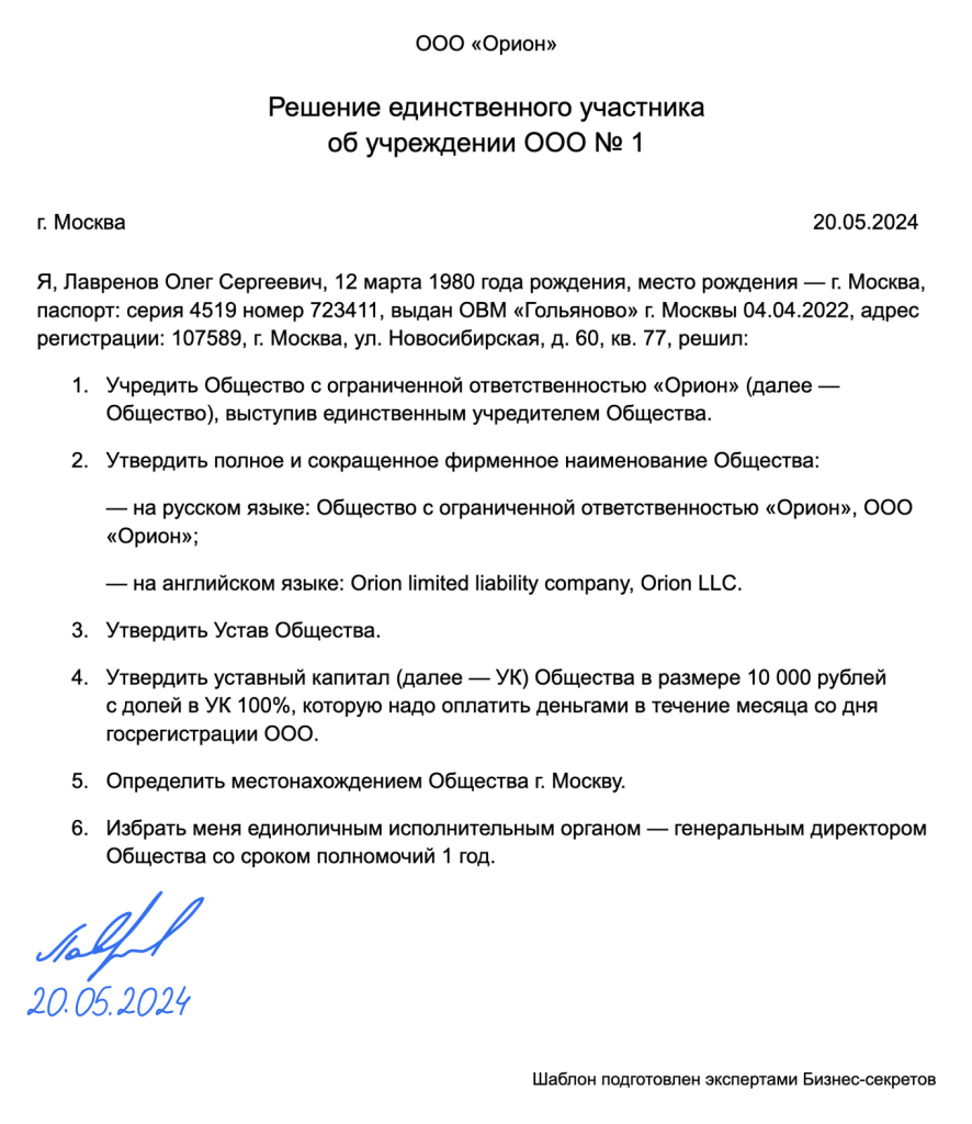 Такой документ об учреждении организации готовит учредитель, которому принадлежит все 100% организации, то есть – один учредитель.